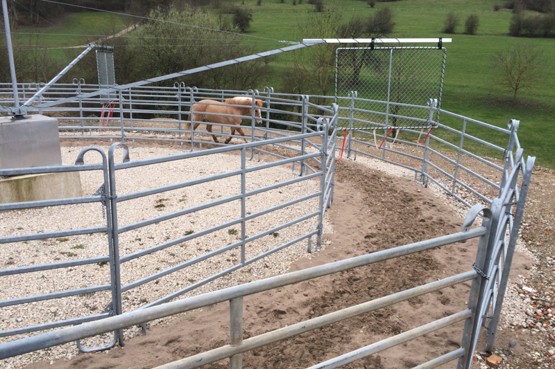 Es ist noch ein bischen Tüftelarbeit notwendig gewesen, aber jetzt haben wir die neue Führanlage in Betrieb. Hier können sich bis zu vier Pferde an der frischen Luft im Schritt und im Trab "die Beine vertreten". Das ist natürlich keine Alternative zum Training oder zum Weidegang, aber es ist eine feine Ergänzung und zusätzliche Bewegung. Zum Beispiel für Pferde die aus irgendeinem Grund in der Box gehalten werden, für zu dicke Pferde, die sich viel bewegen sollen oder zum entspannten Konditionsaufbau.