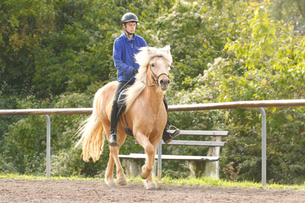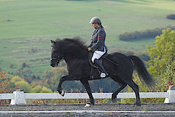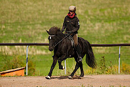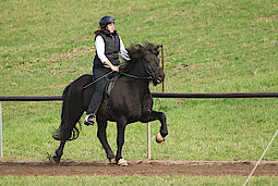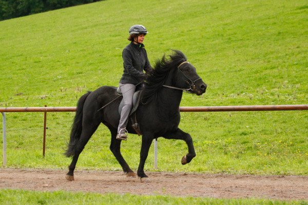 Rosl hatte ausserdem den vierversprechenden Silfur von Kerstin Klein im leichten Tölt und Viergang genannt und die junge Farbwechslerstute Kylja vom Ponsheimer Hof. Da Sabrina kein Pferd im leichten Viergang hatte, Rosl aber eigentlich zwei (Silfur und Kylja) haben wir hier ebenfalls einen Reitertausch gemacht und Sabrina ist mit Kylja im Viergang gestartet.