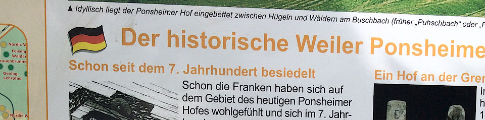 1291 wurde der historische Weiler Ponsheim, von dem kaum noch etwas bekannt ist, erstmals urkundlich erwähnt. In einer Niederschrift, welche die Teilung von Allodialgütern am Palmsonntag, 15. April 1291 dokumentierte, wurde erstmals der Name des Ortes genannt: "ultra ripam versus villam de Pontsemh...", also: "am Ufer gegen das Dorf Ponsheim...".